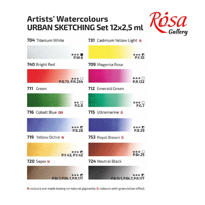 Akvarelové farby Rosa Gallery sú vyvinuté v spolupráci s profesionálnymi umelcami, aby sa zabezpečila kvalita spĺňajúca požiadavky umelcov. Farby sú vyrobené z organickej arabskej gumy a jemne mletých organických a anorganických pigmentov. Výsledkom sú čisté a živé farby, dokonalá priľnavosť, intenzívnosť, ale zároveň akvarelovým farbám charakteristická priehľadnosť. Farby zaručujú skvelé výsledky miešania a dobrú roztierateľnosť aj na jemných akvarelových papieroch. Nechajte sa inšpirovať bohatou farebnou škálou umeleckých farieb a preneste svoje predstavy na plátno.