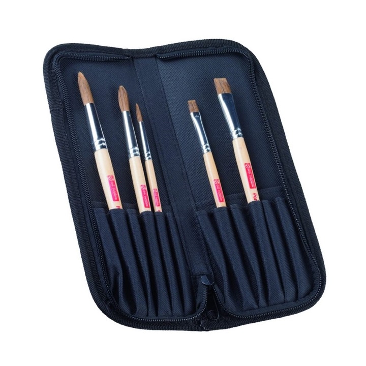 Štetce na maľovanie Talens ArtCreation s organizátorom sú vhodné na akvarelové farby a atrament. Štetce na akvarel sú vyrobené kombináciou konského vlasu a mäkkých syntetických vlákien a preto dobre absorbujú vodu. Sada štetcov obsahuje 3 okrúhle štetce vhodnejšie na detailnejšie práce vo veľkostiach 6, 10 a 14 a 2 ploché štetce na väčšie plochy vo veľkostiach 8 a 14. Akvarelové štetce sú uložené v čiernom bavlnenom organizéri, ktorý má tvar klasického peračníka. Štetce je možné umývať mydlovou vodou. Po vyčistení prehrabte zväzok vlasov štetca a uchovávajte ich vo vodorovnej polohe so zväzkom vlasov štetca nahor. Ideálny pomocník na cestách.