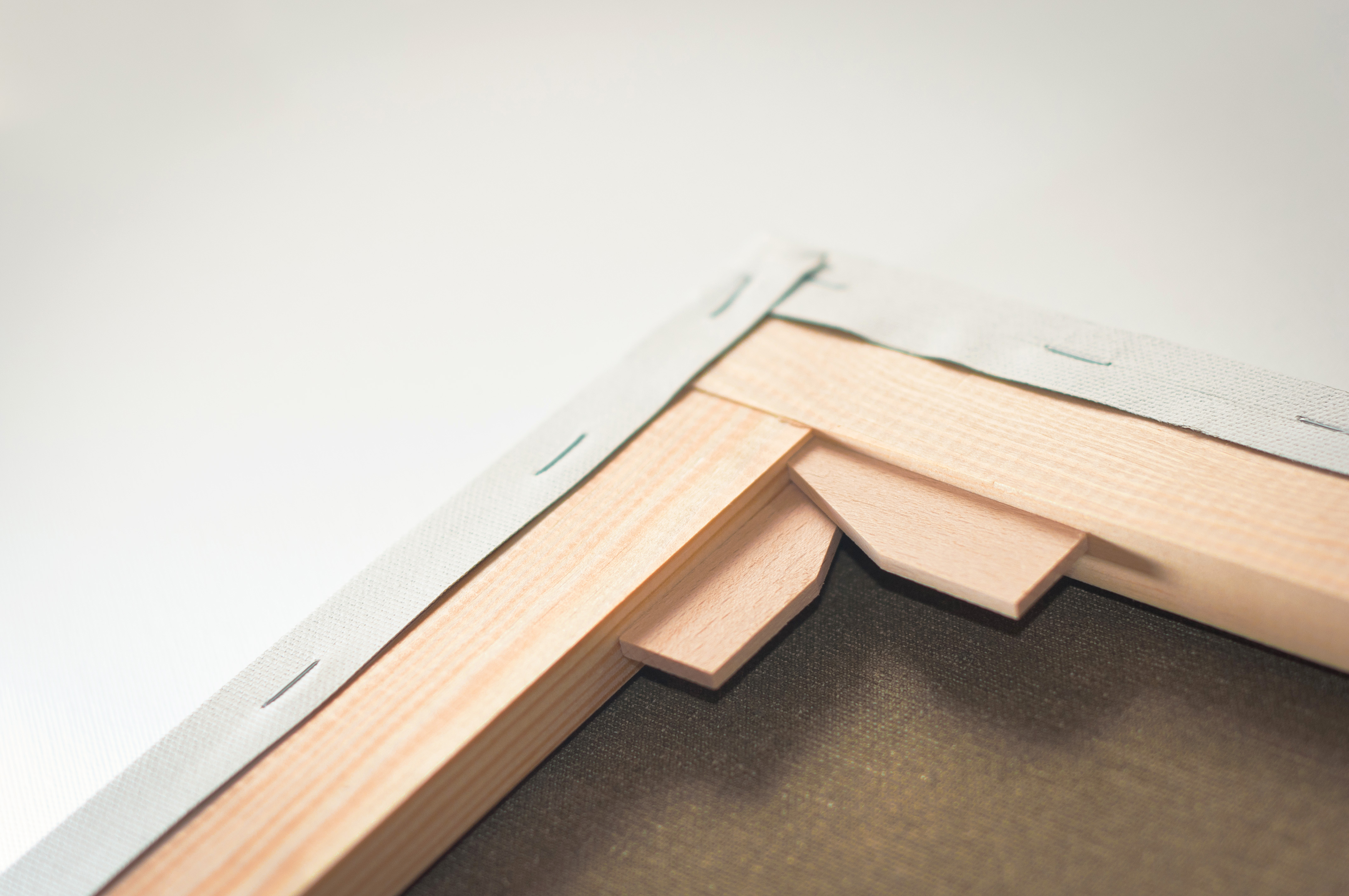 Tieto drevené kolíčky môžete do rámu zasunúť dodatočne, určené sú na to rohové žliabky v napínacích lištách. Prstami vložte klin do každej zo štrbín (hrotom smerujúc nadol a dlhou stranou rovnobežne s rámom). Kladivom jemne poklepte na vrchnú časť klinu. Je dôležité neudrieť príliš silno, aby ste nepoškodili rám. Klin roztiahne priestor medzi dvoma lištami rámu a roztiahne plátno. Opakujte vo všetkých rohoch.